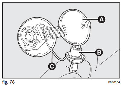 Dévisser le bouchon B à l'aide de la clé de contact. La fermeture étanche peut provoquer une légère hausse de pression dans le réservoir. Par conséquent, le bruit d'aspiration qu'on entend lorsqu'on dévisse le bouchon est tout à fait normal. Pendant le ravitaillement, accrocher le bouchon au dispositif aménagé à l'intérieur du volet, comme l'indique fig. 76.