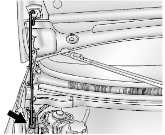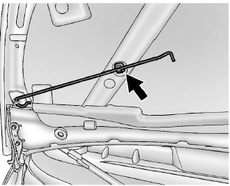 Retirer le support de capot de son emplacement de maintien, du côté passager arrière du compartiment moteur, puis le bloquer dans sa fixation, du côté inférieur du capot. La tige de support de capot doit émettre un déclic lorsqu'elle est remise dans son logement pour éviter les dégâts au capot.